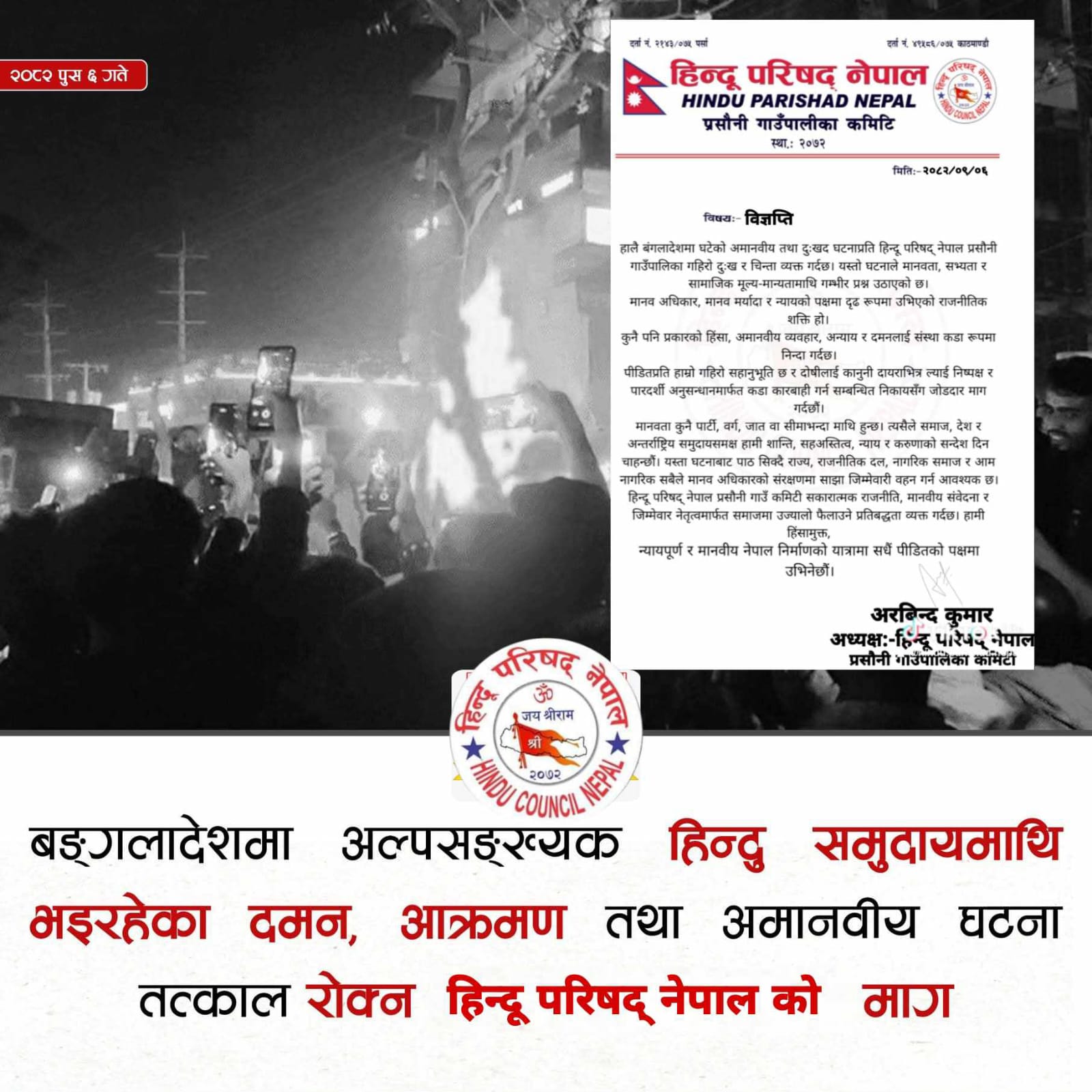त्यस्तै, बङ्गलादेश सरकारलाई दोषीहरू पहिचान गरी निष्पक्ष, पारदर्शी र कडा कानुनी कारबाही गर्न तथा भविष्यमा यस्ता घटना दोहोरिन नदिन ठोस संरचनात्मक कदम चाल्न कडा माग गर्दै हिन्दू परिषद् नेपाल प्रसौनी गाउँपालिका का अध्यक्ष अरबिन्द कुमारले बताएका छन् ।